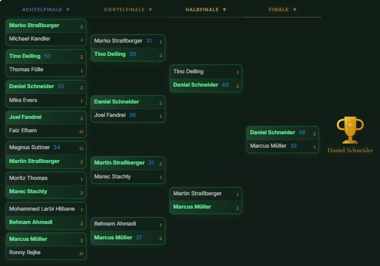 Daniel Schneider vom Verein Sax Max Dresden holt sich den Titel beim fünften Ranglistenturnier der laufenden Saison im Drei-Länder-Ranking. In einem umkämpften Finale gewinnt Daniel gegen Marcus Müller vom SPC Hohenstein-Ernstthal mit 2:1.
