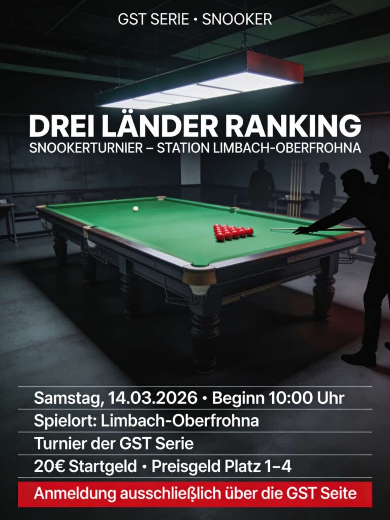 Die Anmeldung zum Turnier ist noch bis zum 13.03.26 um 23:59 Uhr möglich: German Snooker Tour – Turnier-Meldeliste – GST – Jürgen Kesseler